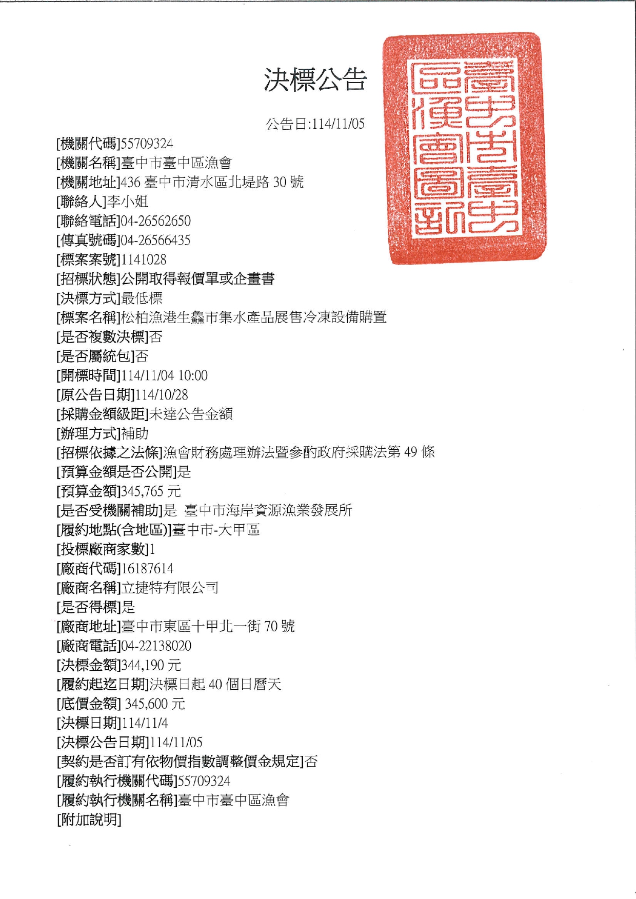 「松柏漁港生鱻市集水產品展售冷凍庫設備購置」招標案決標公告